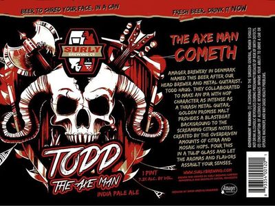 English: For quite some time the Amager crew has been discussing this question: which person is the most rock’n’roll in the whole craft beer world - is it Barnaby Struve of Three Floyds or is it Todd Haug of Surly Brewing? In the end it wasn’t really all that difficult to decide since only Todd has played for Laura Dern in a David Lynch movie (yeah, Nicolas Cage was in that same movie, but since when did he count?) AND Todd plays the guitar in both a speed metal band and a stoner band. Add to that that Todd and his wife Linda are some of the nicest people to hang out with. So Todd, here’s to you: "Todd - The Axe Man" - a potent IPA loaded with fresh American aroma hops on a base of rich Golden Promise malt, Surly’s signature malt. Raise a glass to Todd, world class brewer - and master of the axe! Bonus facts about Todd: yes, he DID actually have a perm in his younger days (his wife confirms) and he does indeed love cats an awful lot.