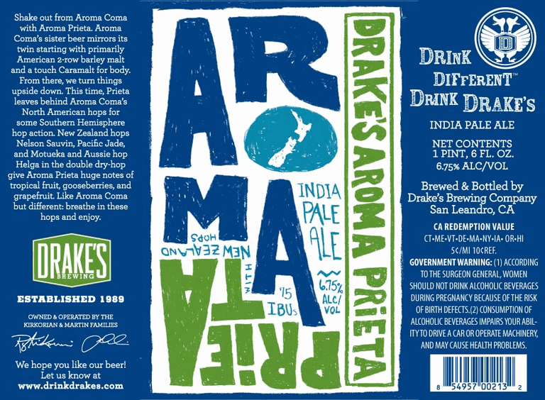 Shake out from Aroma Coma with Aroma Prieta. Aroma Coma’s sister beer mirrors its twin starting with primarily American 2-row barley malt. and a touch of Caramalt for body. From there, we turn things upside down. This time, Prieta leaves behind Aroma Coma’s North American hops for some Southern Hemisphere hop action. New Zealand hops Nelson Sauvin, Pacific Jade, and Motueka and Aussie hop Helga in the double dry-hop give Aroma Prieta huge notes of tropical fruit, gooseberries, and grapefruit. Like Aroma Coma but different: breathe in these hops and enjoy.