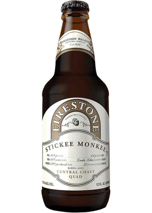 Stickee Monkee is meticulously brewed with Belgian candi sugar in the classic Quadrupel manner, then aged for more than a year in retired bourbon barrels to create a stylistic outlier that we call a "Central Coast Quad". The result is a beer that offers profound molasses flavors with notes of toasted oak, coconut, leather and cigar tobacco. Enjoy it now, or cellar in a cool, dark place.