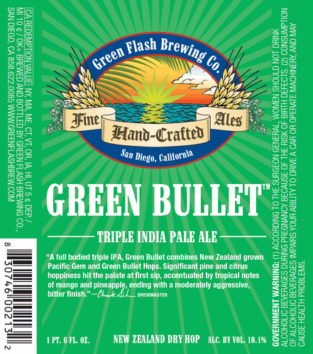 A full-bodied Triple IPA, Green Bullet combines New Zealand grown Pacific Gem and Green Bullet hops. Significant pine and citrus hoppiness hit the palate at first sip, accentuated by tropical notes of mango and pineapple, ending with a moderately aggressive, bitter finish.