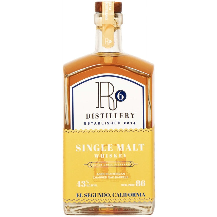 R6 Distillery Single Malt Whiskey is 100% Malt grain specially selected by our founder Rob Rubens. It is a blend of 4 different malts: Peated - Distiller's - Chocolate - Coffee. Slightly smokey, a true American single malt aged for 2+ Years