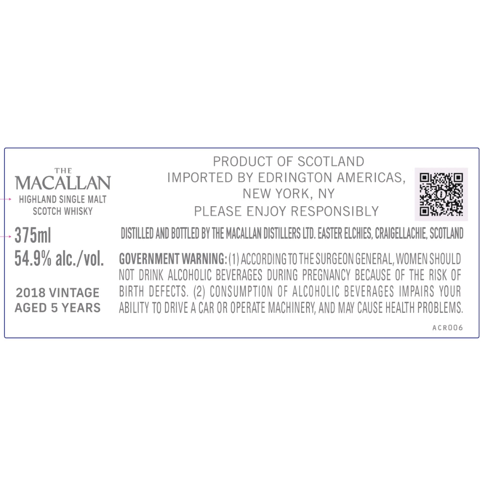 Introducing The Macallan Highland Single Malt Scotch Whisky, a distinguished product of Scotland. This 2018 vintage, aged for 5 years, offers a robust experience with an alcohol content of 54.9% by volume. Available in a 375ml bottle, this exquisite whisky is distilled and bottled by The Macallan Distillers Ltd. in Easter Elchies, Craigellachie, Scotland. Imported by Edrington Americas in New York, NY, this Scotch whisky invites you to enjoy responsibly.